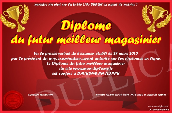 Envoyez par email votre Diplome du futur meilleur magasinier personalisé