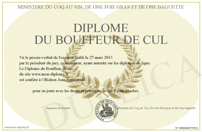 Envoyez par email votre Diplôme du Bouffeur de cul personalisé