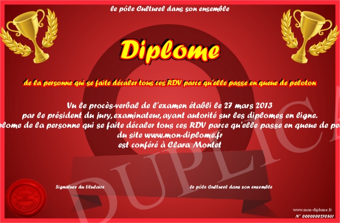 Envoyez par email votre Diplôme de la personne qui se faite décaler tous ces RDV parce qu'elle passe en queue de peloton personalisé