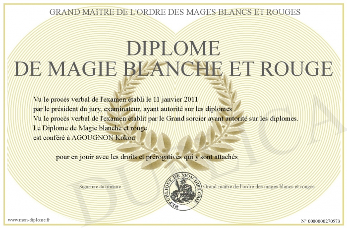 Envoyez par email votre Diplôme de Magie blanche et rouge personalisé