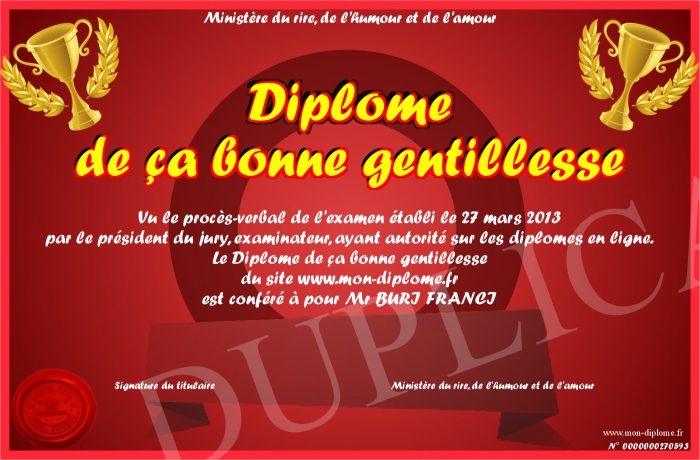 Envoyez par email votre Diplome de ça bonne gentillesse personalisé