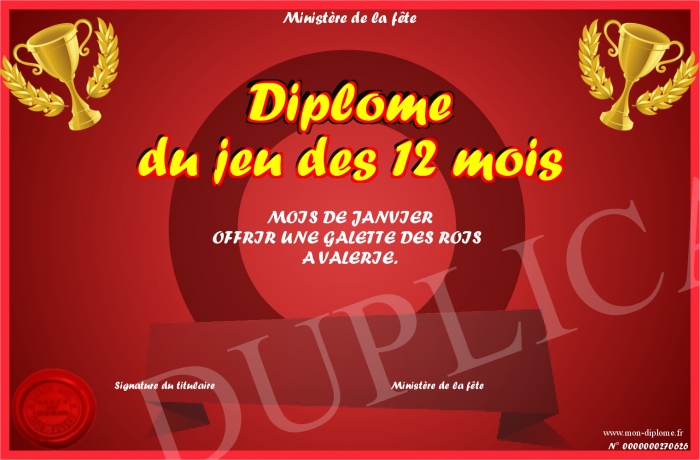 Envoyez par email votre Diplôme du jeu des 12 mois personalisé