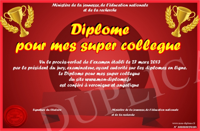Envoyez par email votre Diplome pour mes super collegue personalisé