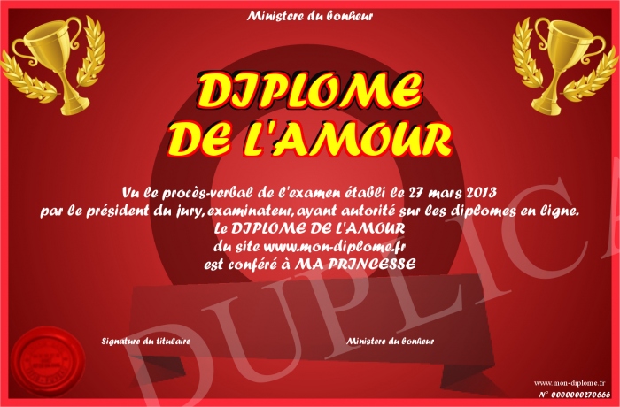 Envoyez par email votre DIPLOME DE L'AMOUR personalisé