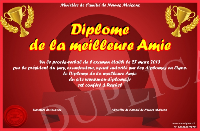 Envoyez par email votre Diplome de la meilleure Amie personalisé