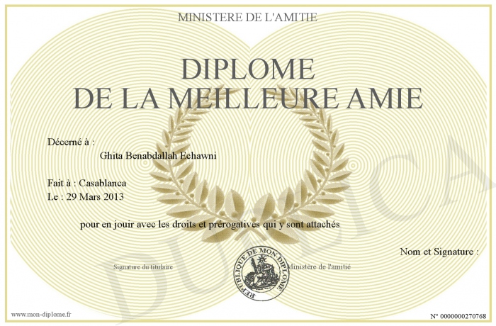 Envoyez par email votre Diplôme de la meilleure amie personalisé