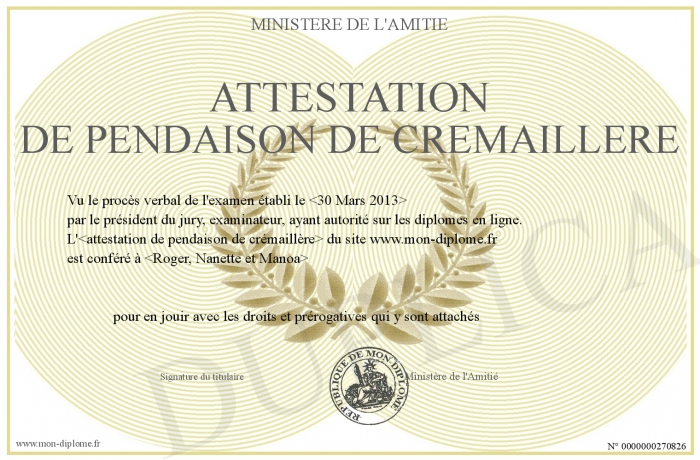 Envoyez par email votre Attestation de Pendaison de Crémaillère personalisé