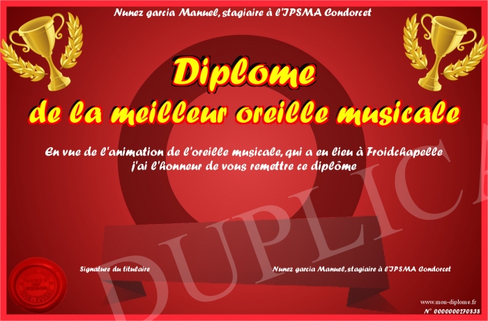 Envoyez par email votre Diplôme de la meilleur oreille musicale personalisé