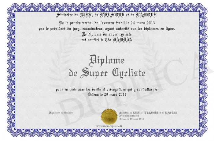 Envoyez par email votre Diplôme de Super Cycliste personalisé