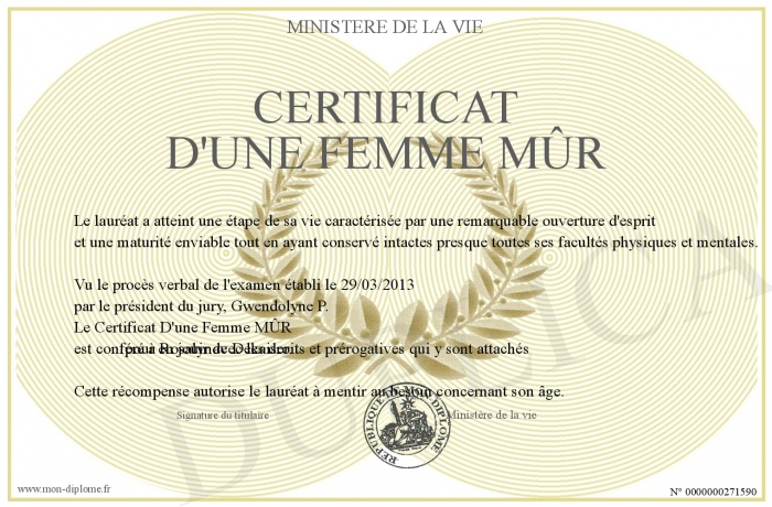 Envoyez par email votre Certificat D'une Femme MÛR personalisé