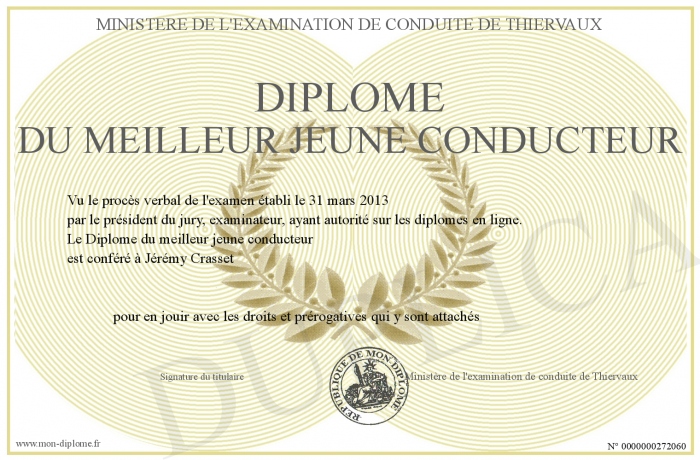 Envoyez par email votre Diplôme du meilleur jeune conducteur personalisé