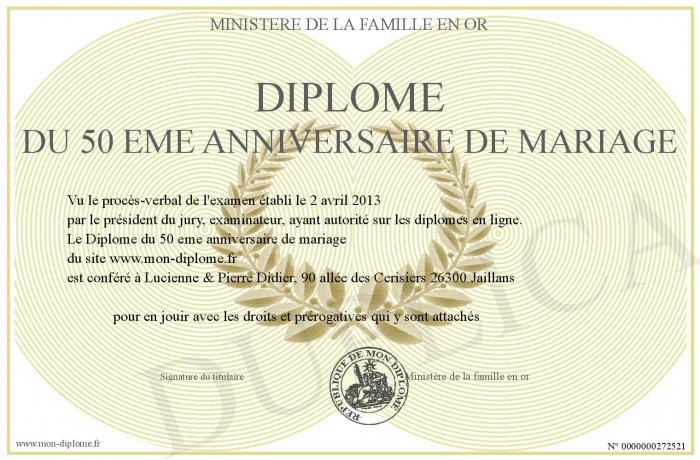 Envoyez par email votre Diplôme du 50 eme anniversaire de mariage personalisé