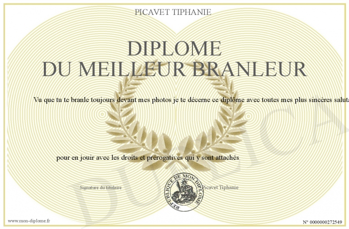 Envoyez par email votre Diplôme du meilleur branleur personalisé
