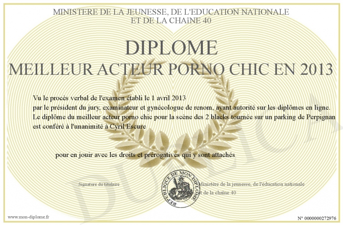 Envoyez par email votre Diplôme meilleur acteur porno chic en 2013 personalisé
