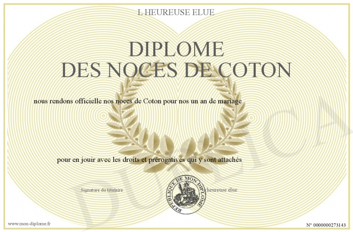 Envoyez par email votre Diplôme des noces de Coton personalisé
