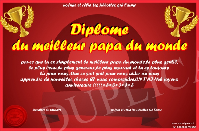 Envoyez par email votre Diplôme du meilleur papa du monde personalisé