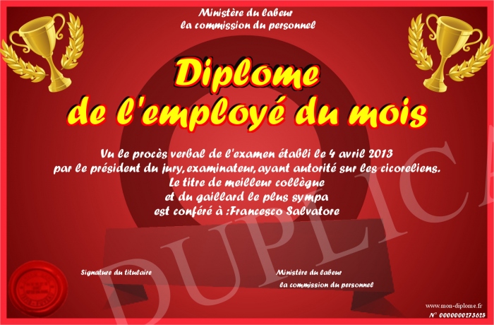 Envoyez par email votre Diplôme de l'employé du mois personalisé