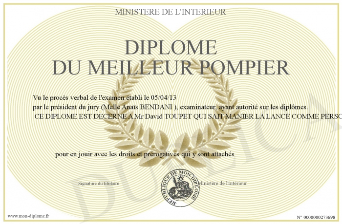 Envoyez par email votre Diplôme du meilleur pompier personalisé