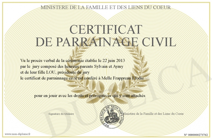 Envoyez par email votre certificat de Parrainage civil personalisé