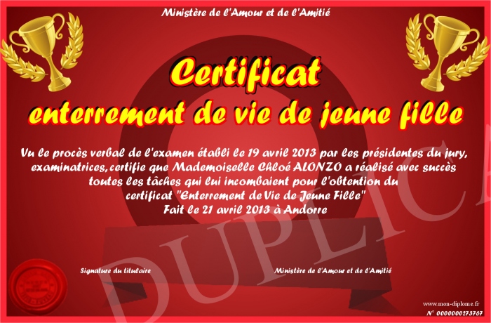 Envoyez par email votre Certificat enterrement de vie de jeune fille personalisé
