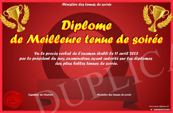 Envoyez par email votre Diplôme de Meilleure tenue de soirée personalisé