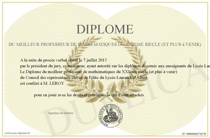 Envoyez par email votre Diplôme du meilleur professeur de mathématiques du XXIème siècle (et plus à venir) personalisé
