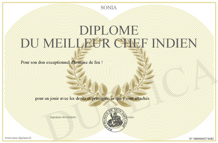 Envoyez par email votre Diplôme du meilleur chef indien personalisé