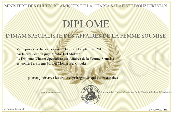 Envoyez par email votre Diplôme D'Imam Spécialiste des Affaires de la Femme Soumise personalisé