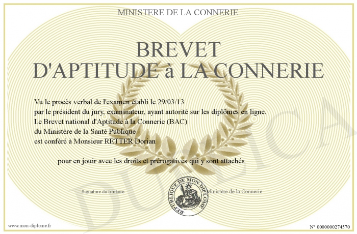 Envoyez par email votre Brevet d'Aptitude à la Connerie personalisé
