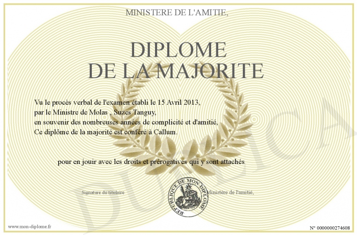 Envoyez par email votre Diplôme de la majorité personalisé