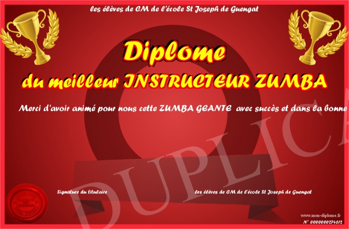 Envoyez par email votre Diplôme du meilleur INSTRUCTEUR ZUMBA personalisé