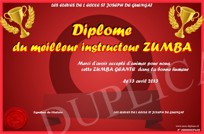 Envoyez par email votre Diplôme du meilleur instructeur ZUMBA personalisé