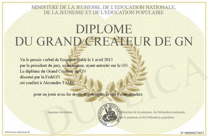 Envoyez par email votre Diplôme du Grand Créateur de GN personalisé