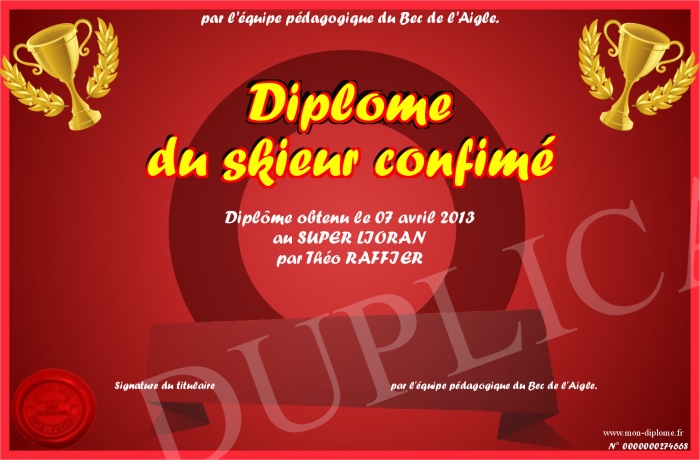 Envoyez par email votre Diplôme du skieur confimé personalisé