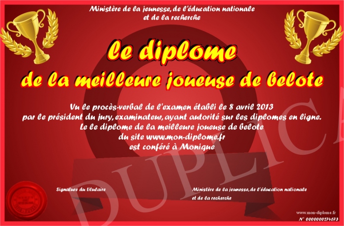 Envoyez par email votre le diplome de la meilleure joueuse de belote personalisé