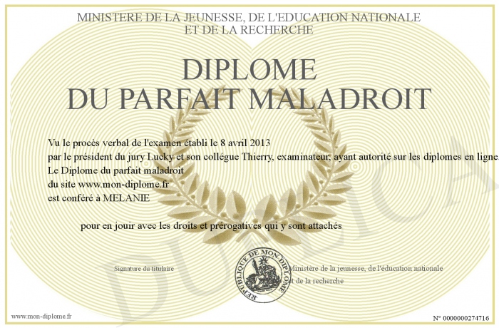 Envoyez par email votre Diplôme du parfait maladroit personalisé