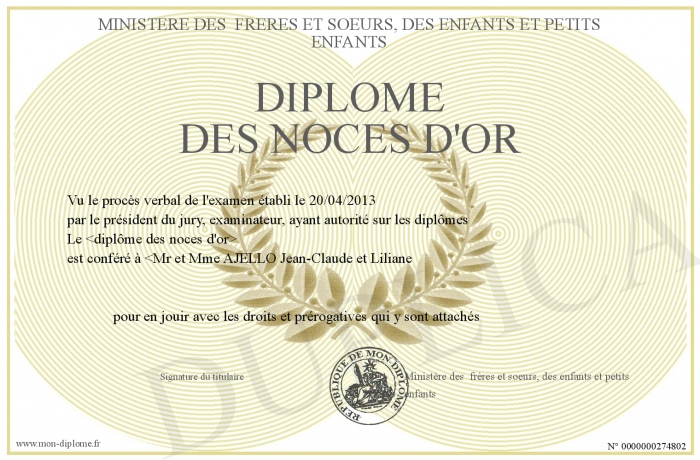 Envoyez par email votre Diplôme des noces d'Or personalisé