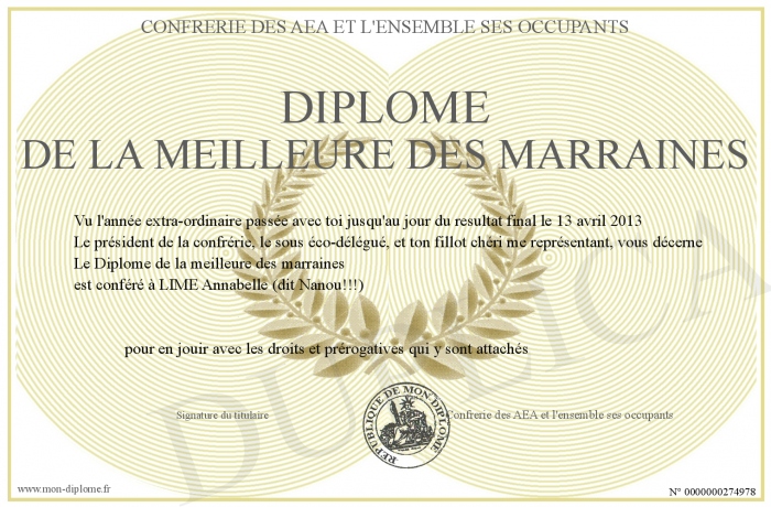 Envoyez par email votre Diplôme de la meilleure des marraines personalisé