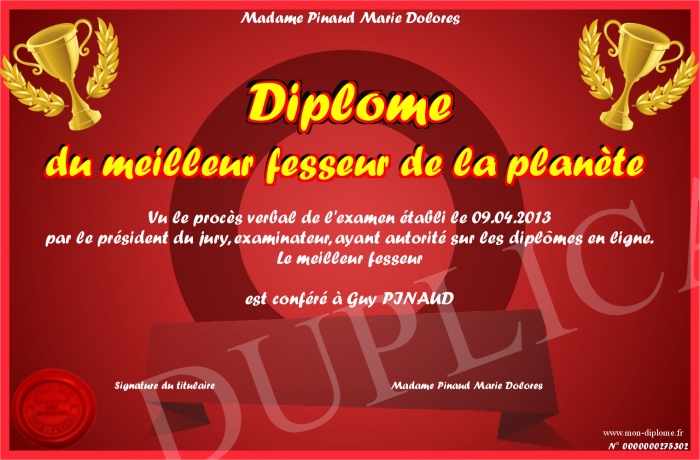 Envoyez par email votre Diplôme du meilleur fesseur de la planète personalisé