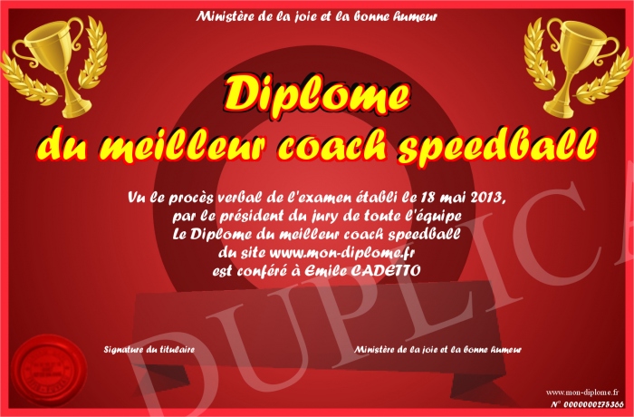 Envoyez par email votre Diplôme du meilleur coach speedball personalisé