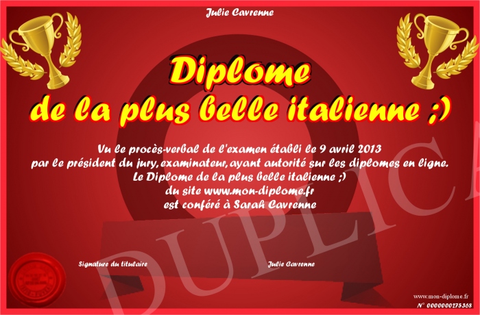 Envoyez par email votre Diplome de la plus belle italienne ;) personalisé