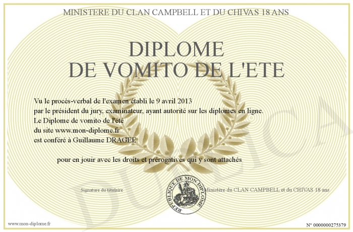 Envoyez par email votre Diplôme de vomito de l'été personalisé