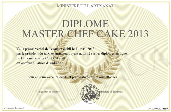 Envoyez par email votre Diplôme Master Chef Cake 2013 personalisé
