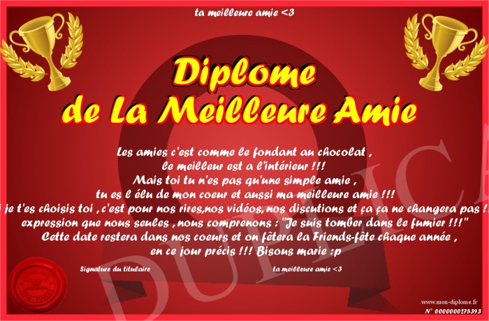 Envoyez par email votre Diplôme de La Meilleure Amie personalisé