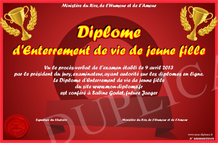 Envoyez par email votre Diplome d'Enterrement de vie de jeune fille personalisé
