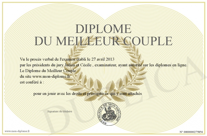 Envoyez par email votre Diplôme du Meilleur Couple personalisé