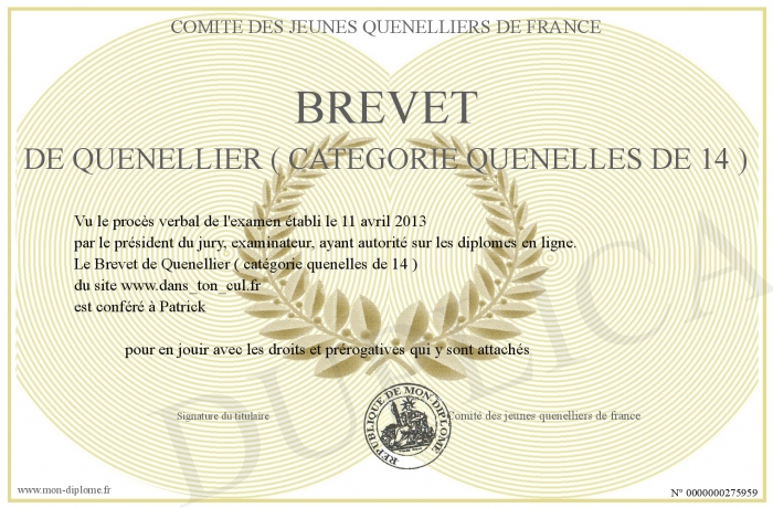 Envoyez par email votre Brevet de Quenellier ( catégorie quenelles de 14 ) personalisé