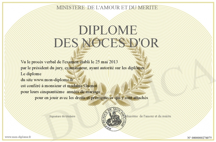 Envoyez par email votre Diplôme des noces d'or personalisé
