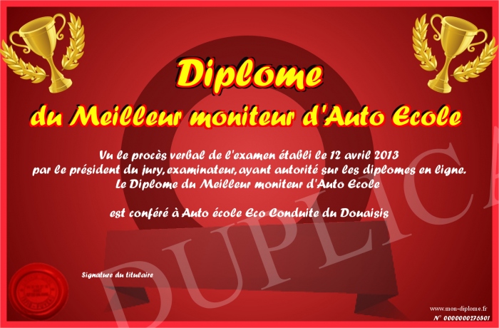 Envoyez par email votre Diplôme du Meilleur moniteur d'Auto Ecole personalisé