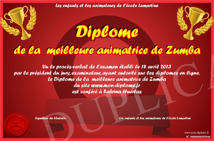 Envoyez par email votre Diplôme de la meilleure animatrice de Zumba personalisé